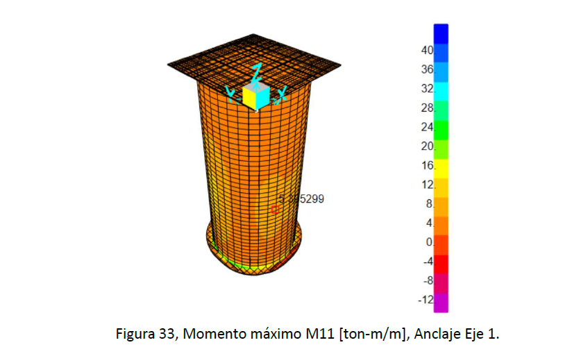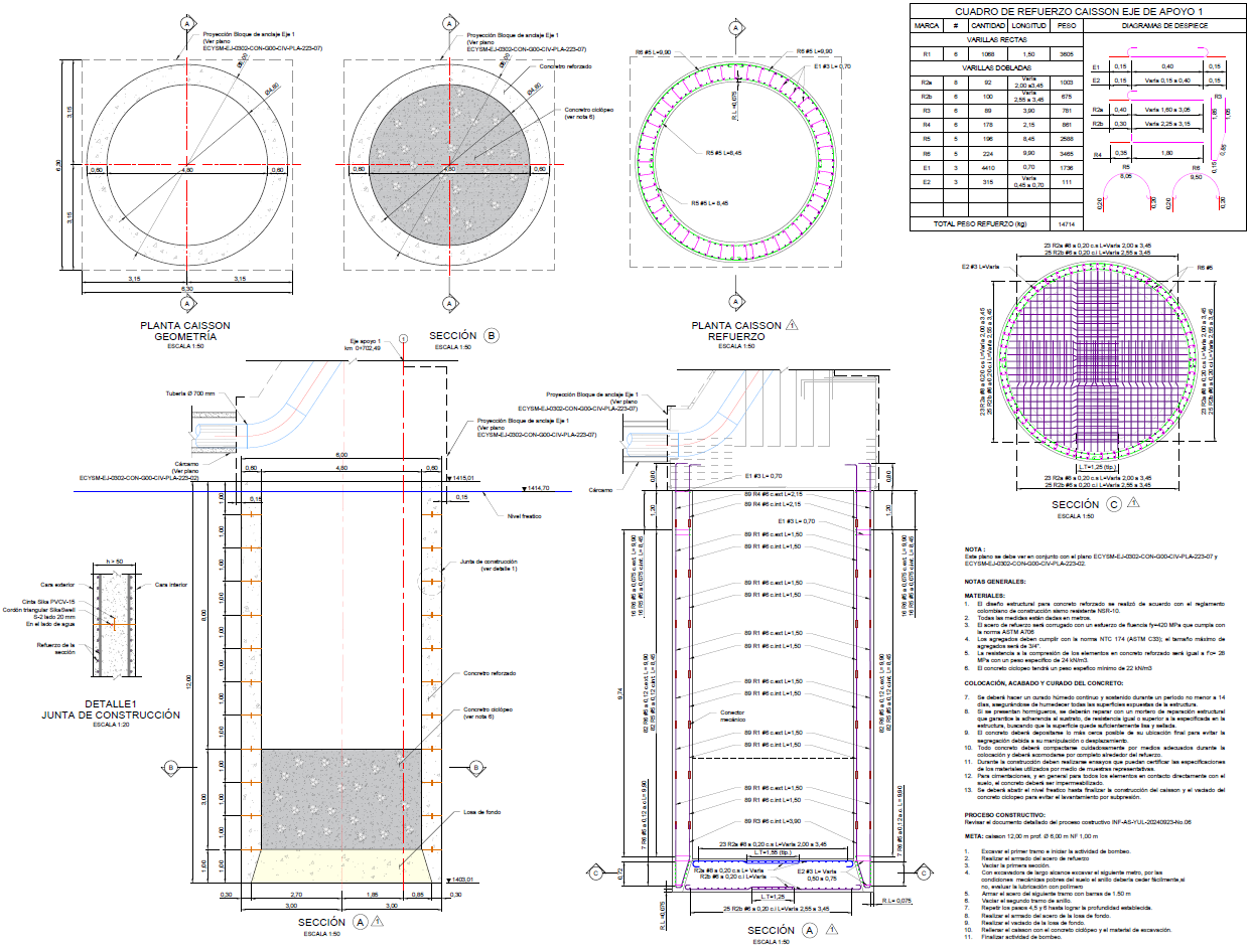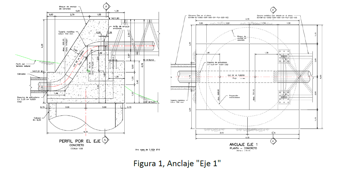 Los dos apoyos laterales de la cercha que soporta la tubería que adicionalmente funcionan como protección de la tubería expuesta, consisten en dos bloques de anclaje en concreto reforzado de 28 MPa. En el Eje 1 se considera el diseño de un bloque de anclaje en concreto reforzado apoyado sobre un caisson de diámetro 6 m con una longitud de 12.00 m, en el eje 2 se considera el diseño de un bloque de anclaje soportado por 4 pilas de 1.20 m de diámetro con una longitud de 8.00 m.