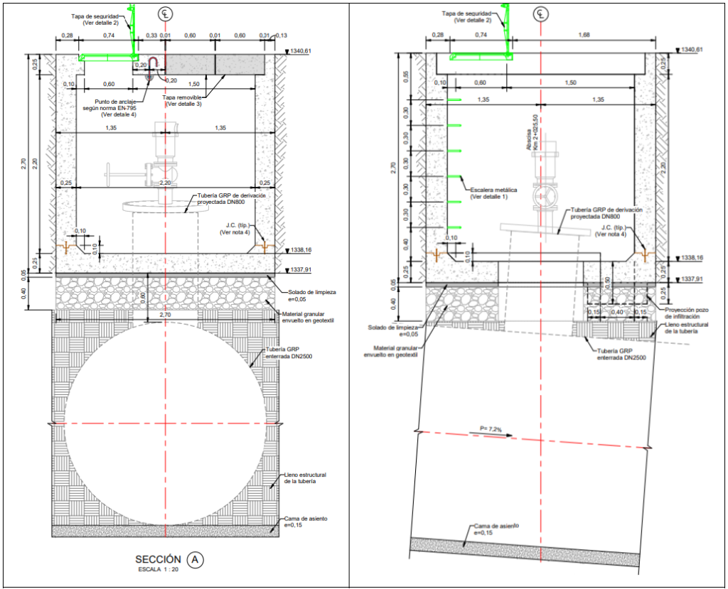 La cámara de inspección cuenta con 2 aberturas de acceso en la losa superior, una de ellas para instalar los accesorios y la otra para el acceso del personal de inspección y mantenimiento, adicionalmente cuenta con dos aberturas en la losa inferior, una de ellas para la tubería de la derivación del tubo principal y la otra para la instalación de un filtro en material granular, el cual permite el drenaje de la cámara hacía el terreno.