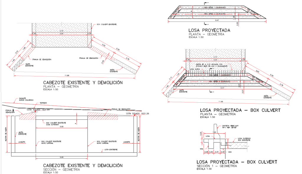 De acuerdo con la información presentada, se requiere la ampliación de la losa en las aletas del cabezote aguas arriba, para lo cual se plantea la demolición de la parte superior del bordillo y las aletas, las cuales permitirán el anclaje de la losa superior.