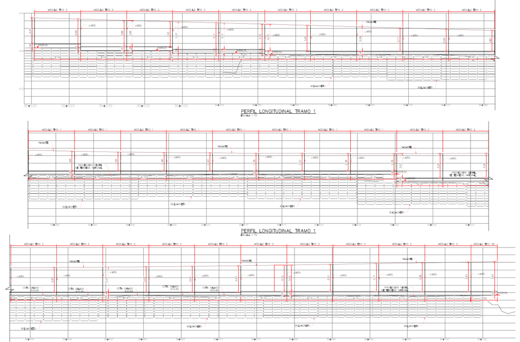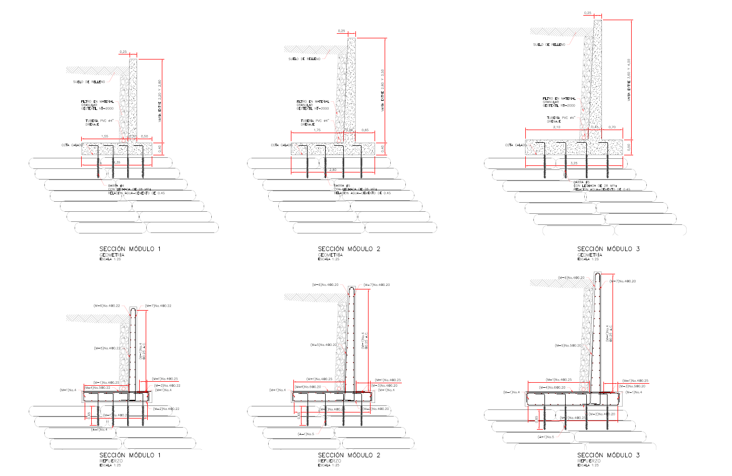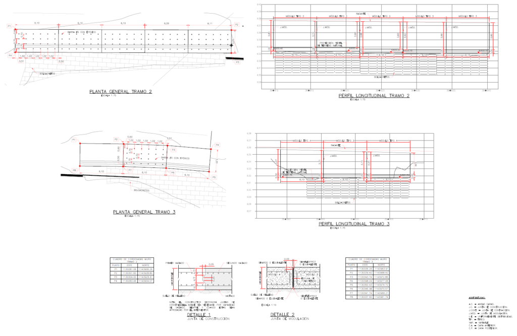 diseño estructural del muro de contención sobre bolsacretos empleado en la estabilización de la calzada de la vía entre el municipio de Peña Lisa y Ciudad Bolívar, en el tramo correspondiente al PR36, en el cual cómo solución inicial se requirió la instalación de unos bolsacretos en el margen izquierdo del rio, los cuales ejercen un control de socavación a la base del talud de la calzada, adicionalmente, durante la ejecución del proyecto, se plantea la construcción de un muro definitivo en concreto reforzado sobre los bolsacretos, el cual permite reconformar la calzada y garantizar su funcionamiento durante la vida útil del proyecto. El muro de contención del km 36 se encuentra divido en 3 tramos principales, los cuales se diferencian principalmente por su forma de apoyo. El tramo 1 y el tramo 2 se encuentran totalmente apoyados sobre bolsacretos, el tramo 3 está compuesto por 2 módulos laterales apoyados sobre el suelo de cimentación y el módulo central apoyado sobre bolsacretos.