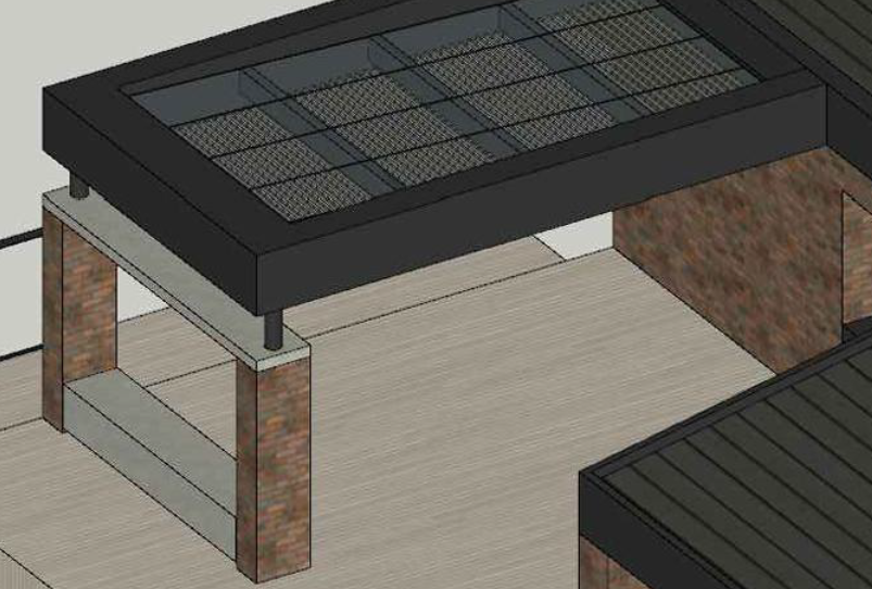 La estructura corresponde a una pérgola metálica dispuesta en la zona exterior del proyecto de vivienda. Está conformada por cuatro parales en tubería estructural de acero, que actúan como elementos portantes principales, y por un sistema de vigas longitudinales y transversales conformadas por perfiles tubulares rectangulares, encargadas de garantizar la rigidez y la adecuada transmisión de cargas entre los apoyos.